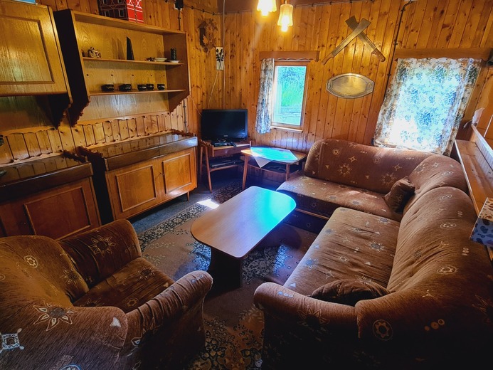 Ausgestattete Küche mit Sitzmöglichkeit (E-Herd, Kühlschrank, Wasserkocher, Mikrowelle), Wohnzimmer mit Kamin, 2x FTV, DVD und 2 Zustellbetten, 2 Schlafzimmer (1/2-durchgängig, 1/4), Bad mit Badewanne und WC, Kombinationsheizung (E-Heizung und Kamin). Freiplatz, Lagerfeuerplatz mit Sitzmöglichkeiten, Gartenmöbel, Terrasse, Räucherkammer, Sandkasten. Parkplatz am Haus (im Winter 100 m vom Haus), Haustier erlaubt.