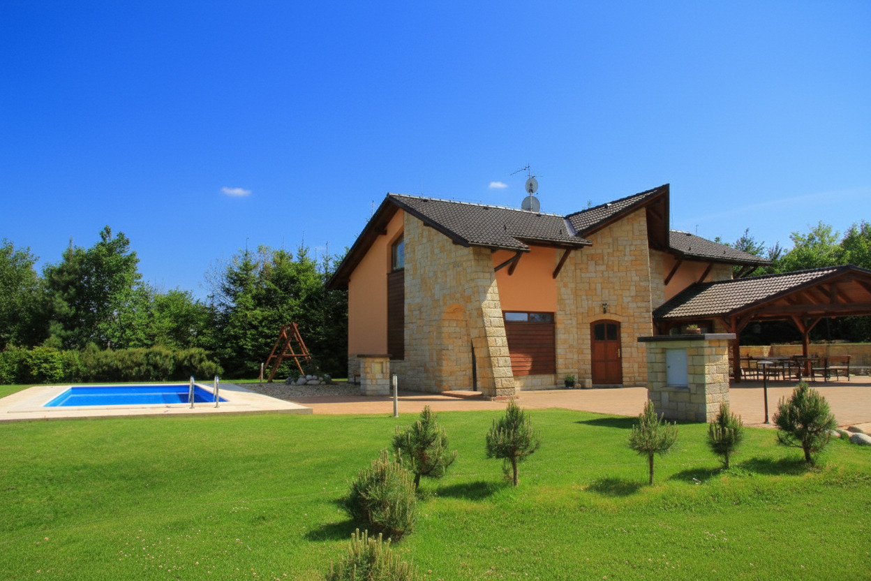 Luxus-Ferienhaus mit solar beheiztem Pool auf einem großen Grundstück mit schöner Aussicht fast alleinstehend, 6 km vom Ort Pecka, 15 km von Nova Paka im Böhmischen Paradies.