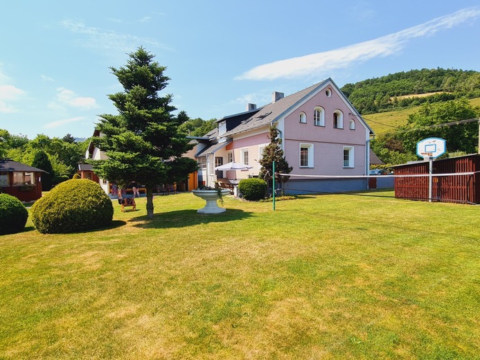 Großes, attraktives und gut ausgestattetes geräumiges Ferienhaus mit überdachtem Swimmingpool in einem Tal in der Nähe des Bergbaches im Dorf Janov, 10 km vom Skigebiet Pricna in den Gelben Bergen.