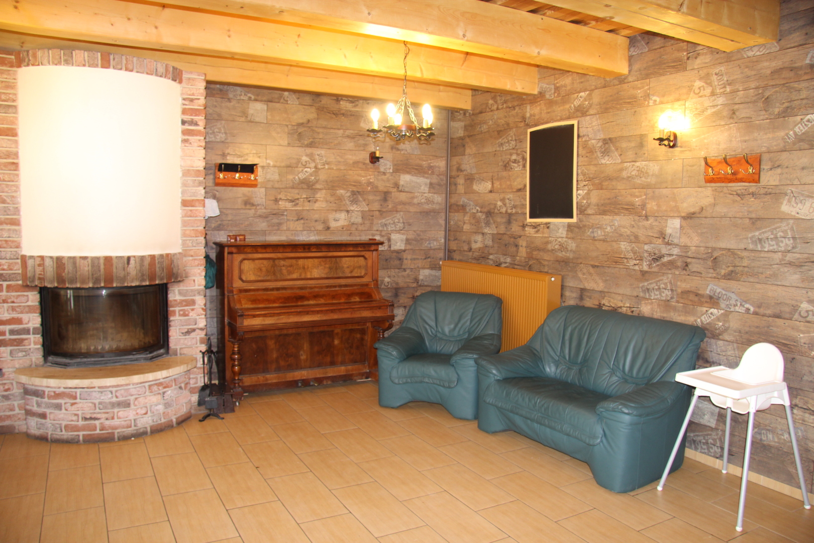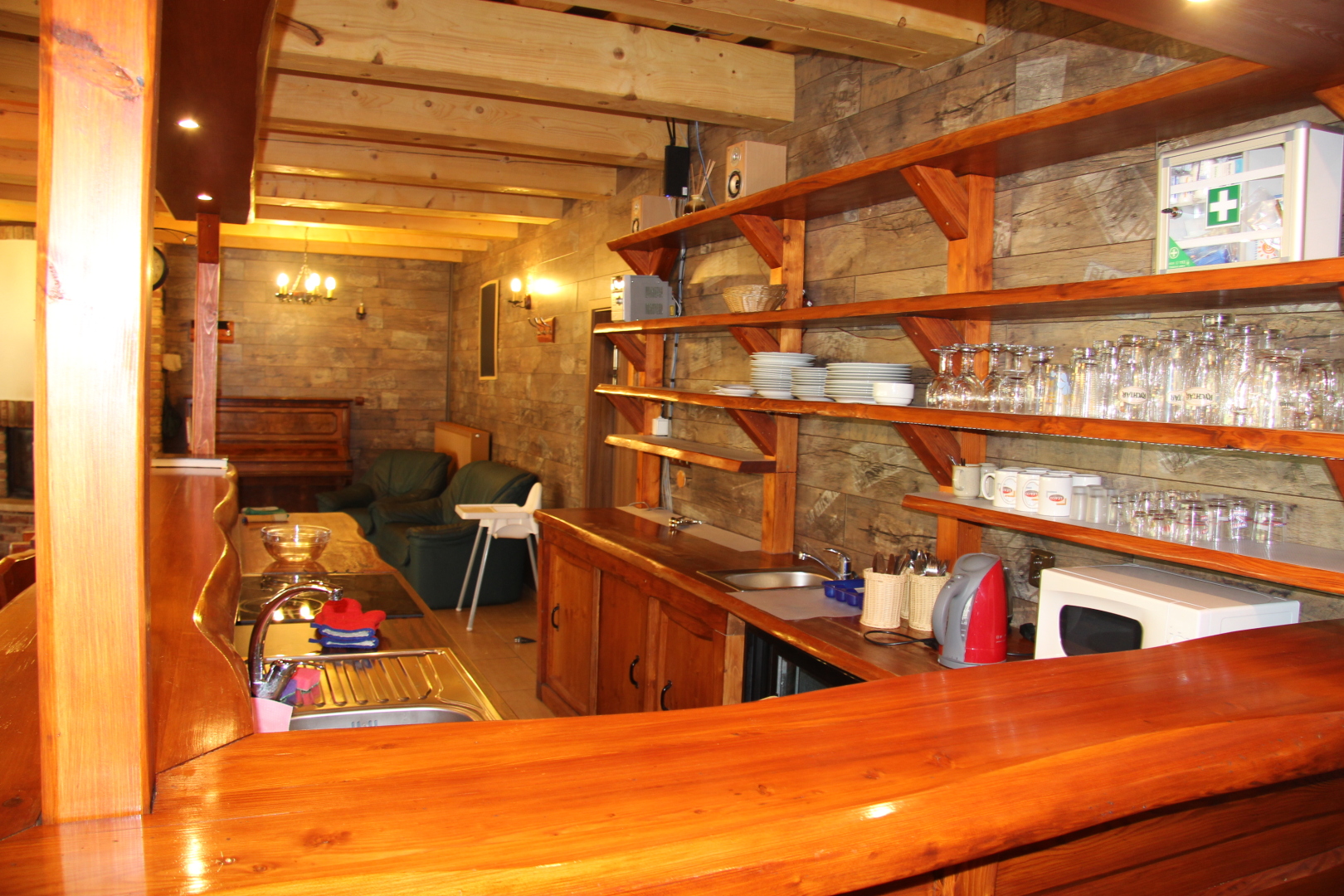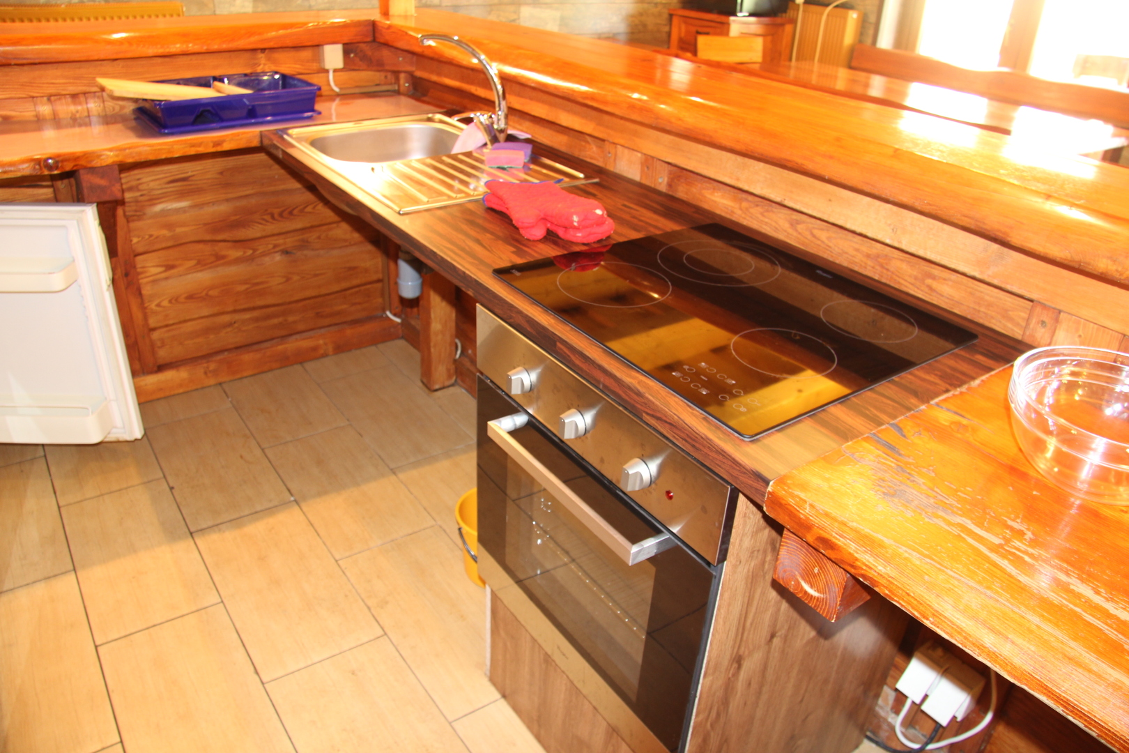 - kitchen (stove with ceramic hob, electric oven, fridge, microwave, dishwasher, electric kettle, coffee maker) in a large living room with a fireplace with a fireplace insert and LCD-SAT-DVD