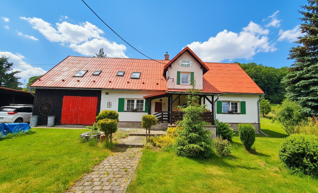Fully equipped kitchen (gas stove, refrigerator, coffee maker, microwave oven, electric kettle) with a living dining room with TV + SAT, 6 bedrooms (5/2, 1/2 children - decreased ceiling), except one, each with shower and toilet, central heating, solid fuel (provided by the landlord). Room for bike and ski storage. Fenced property, open property (large garden and private forest), roofed outdoor seating, fireplace with seating, portable grill, garden furniture, children's corner (sandpit, slide), two tent bases. Parking by the house (roofed parking for 4 cars). Pets with agreement. WiFi internet connection.
