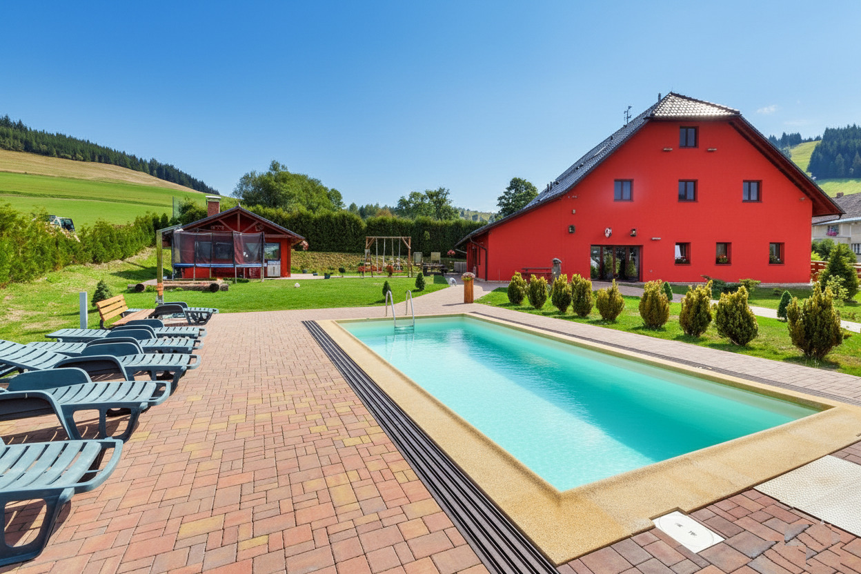 Luxurious, exceptionally attractive holiday house with outdoor swimming pool with covering and sauna, below the Cross Mountain, 200 m from the ski lift and 2 km from Kraliky on the border of the Orlicke Mountains and the Jeseniky Mountains.