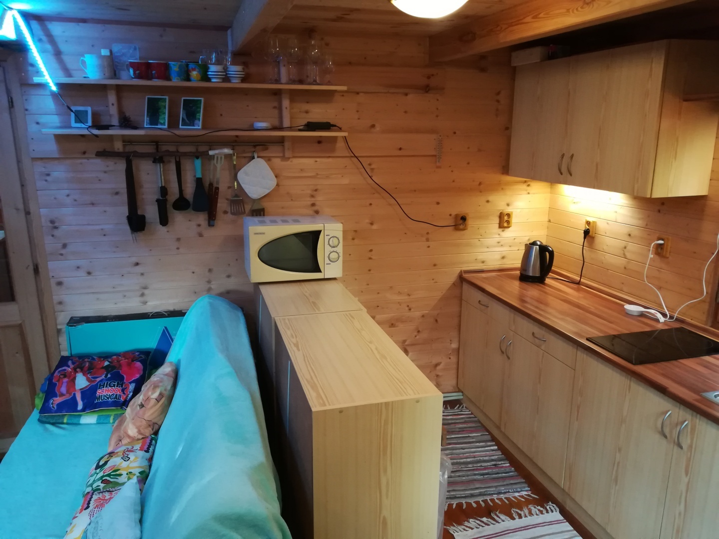 - kuchyňský kout (sklokeramická deska, lednička, mikrovlnná trouba, rychlovarná konvice) v obytné místnosti s jídelním stolem a kachlovými kamny