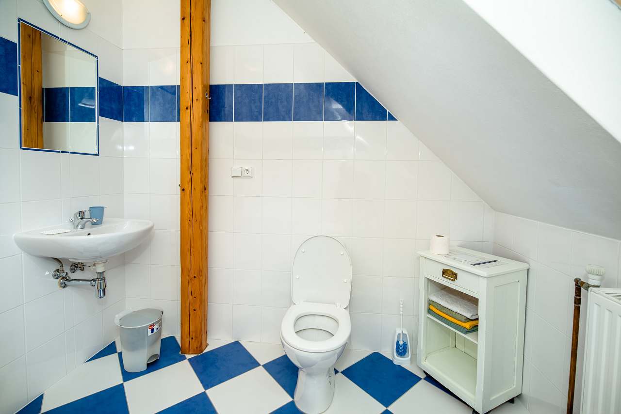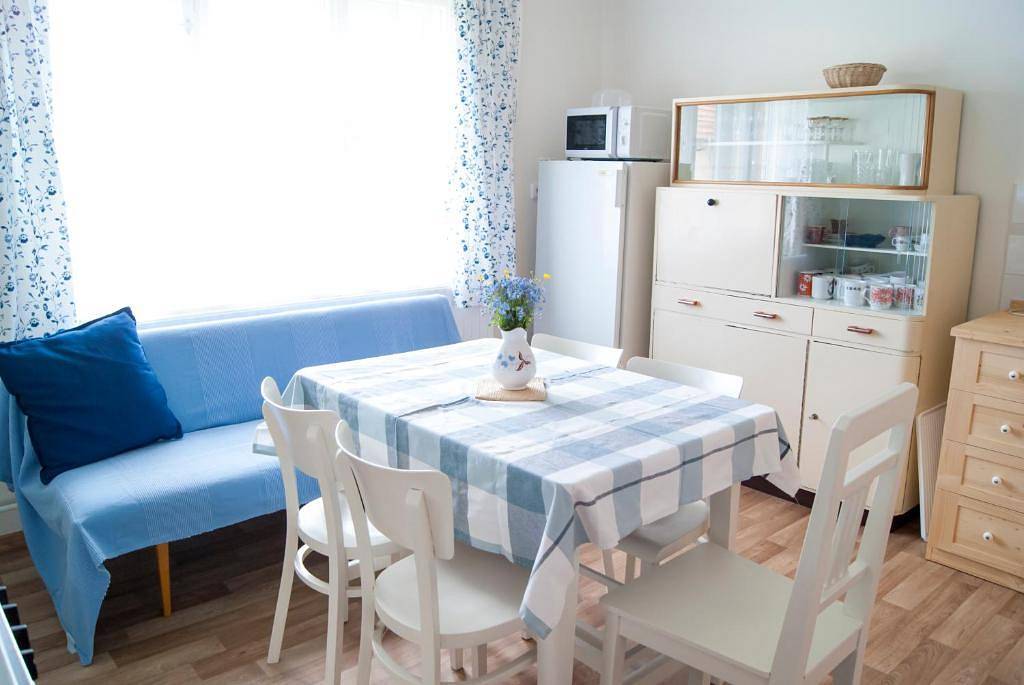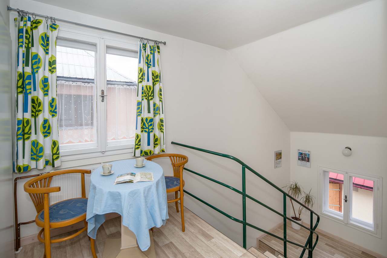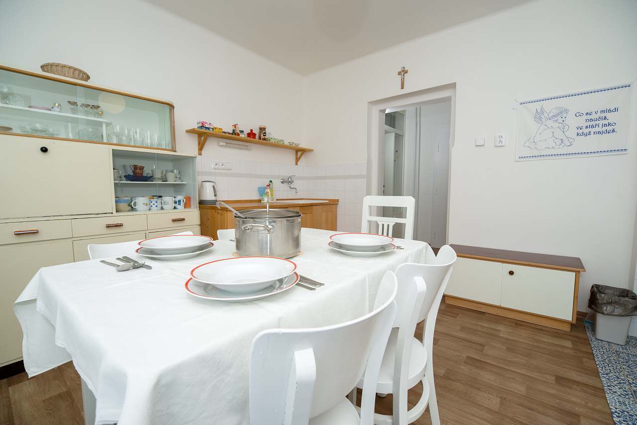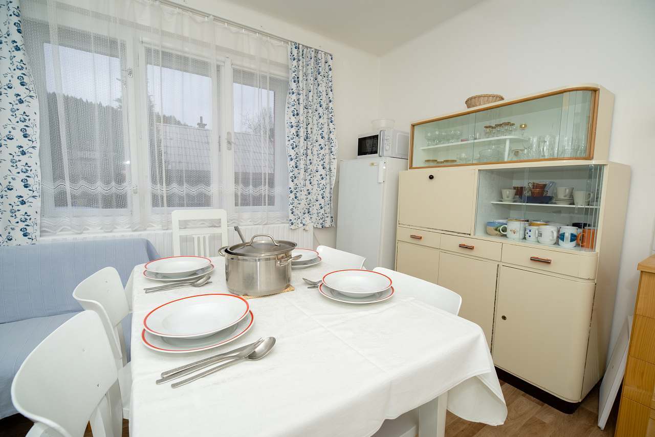 - kuchyně (el. sporák s troubou, kachlový sporák na dřevo, lednička s mrazákem, mikrovlnná trouba, rychlovarná konvice) s posezením