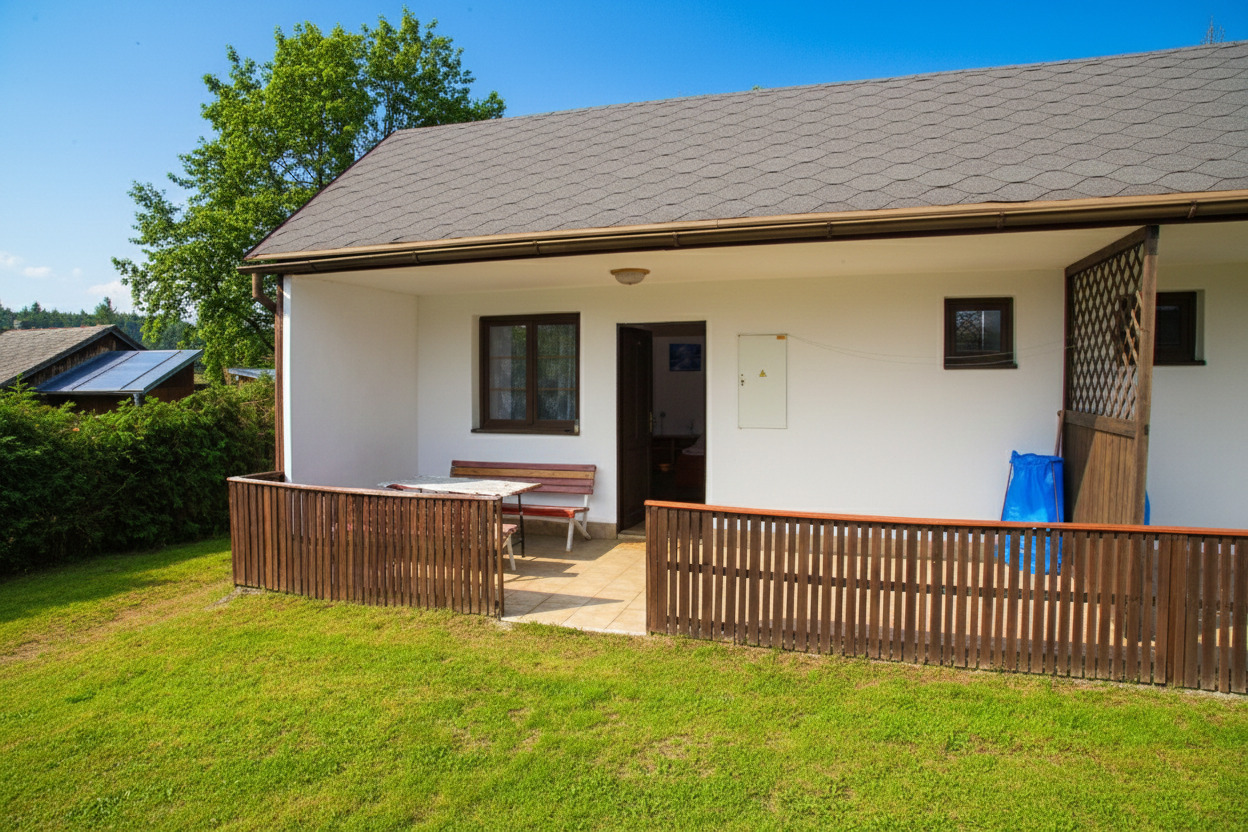 Pěkná chata s venkovním zapuštěným bazénem na velkém oploceném travnatém pozemku, v rekreačním areálu, 200 m od vodní nádrže Orlík a 25 km od Zvíkovského Podhradí v jižních Čechách.