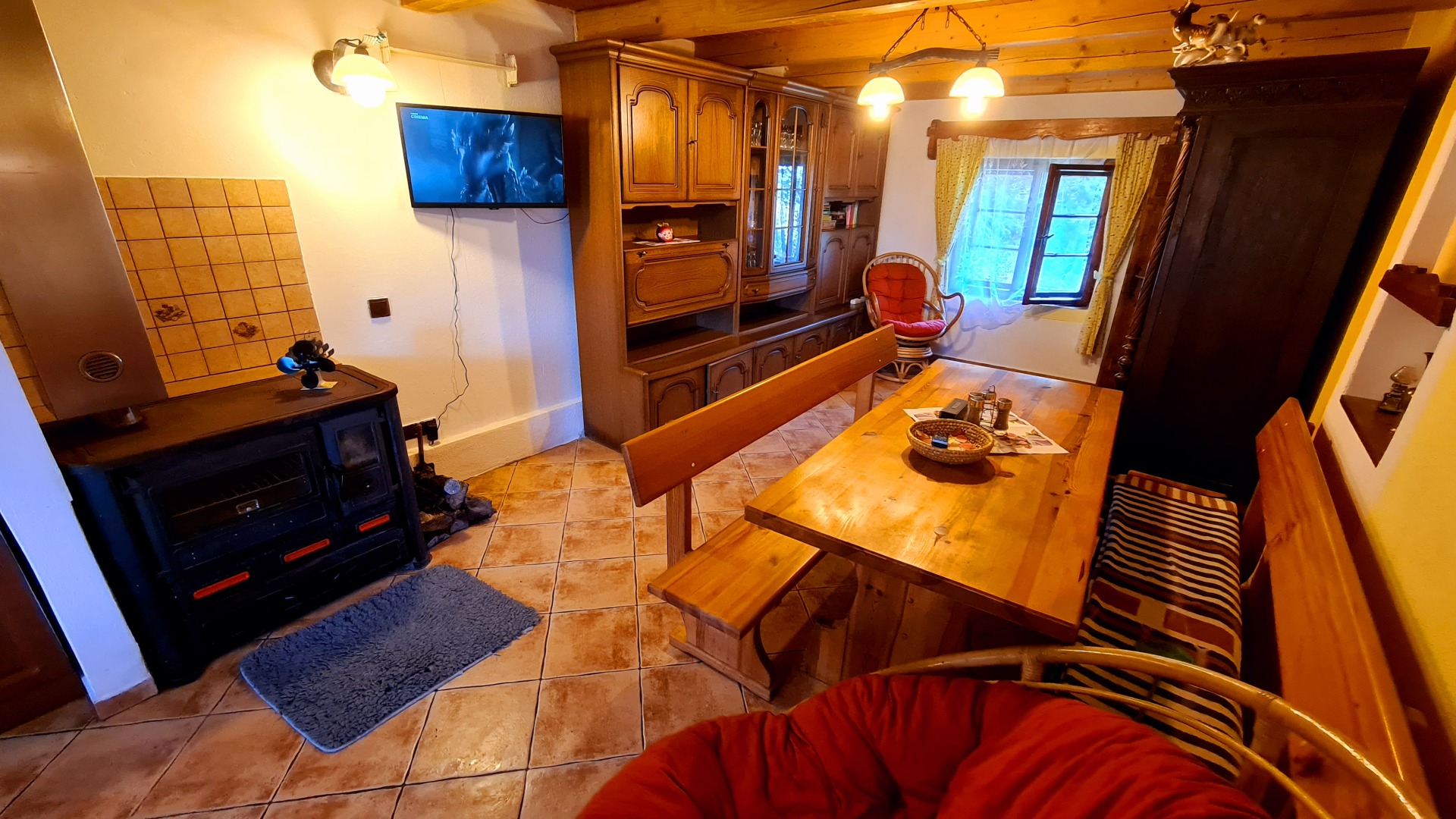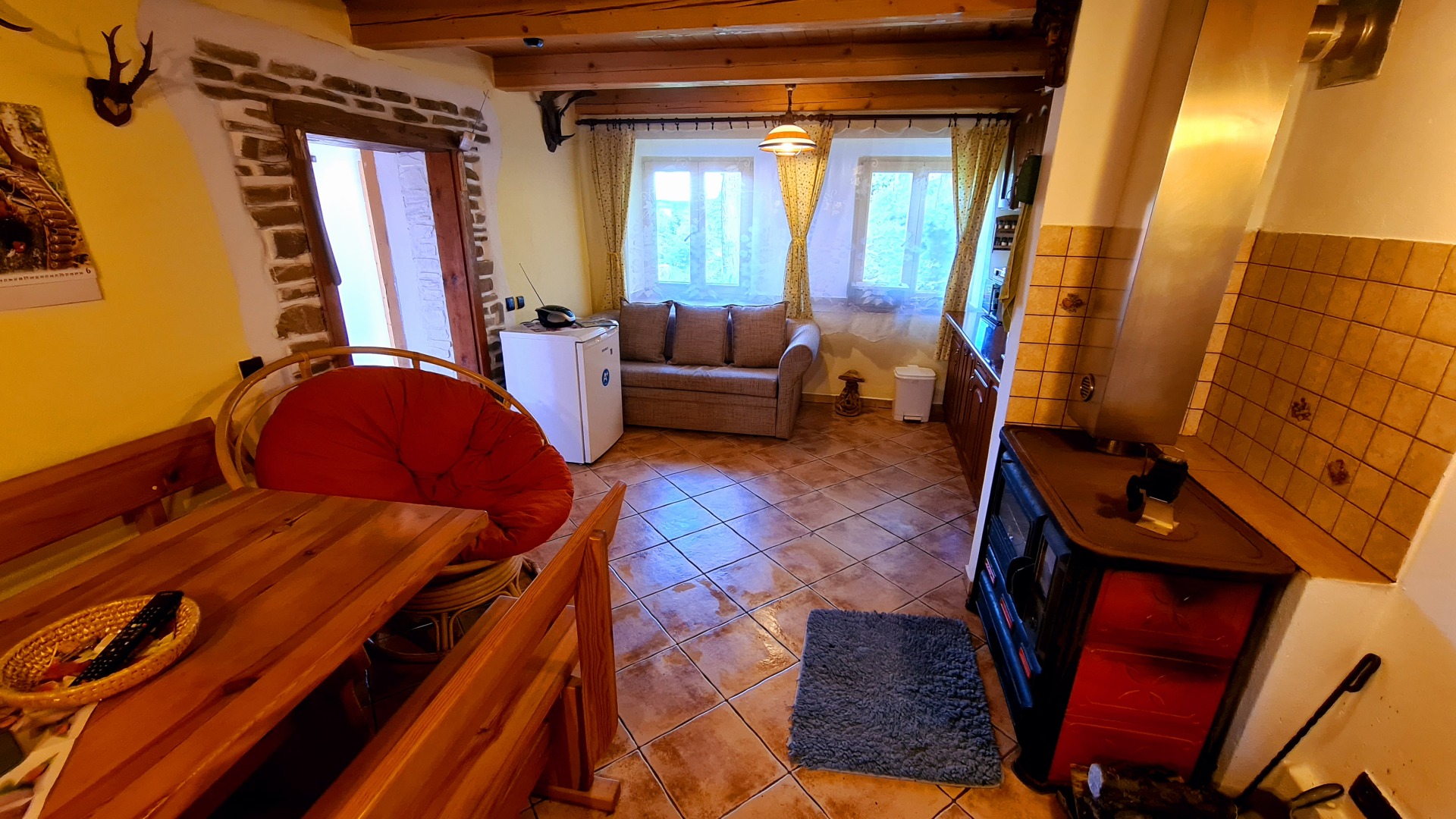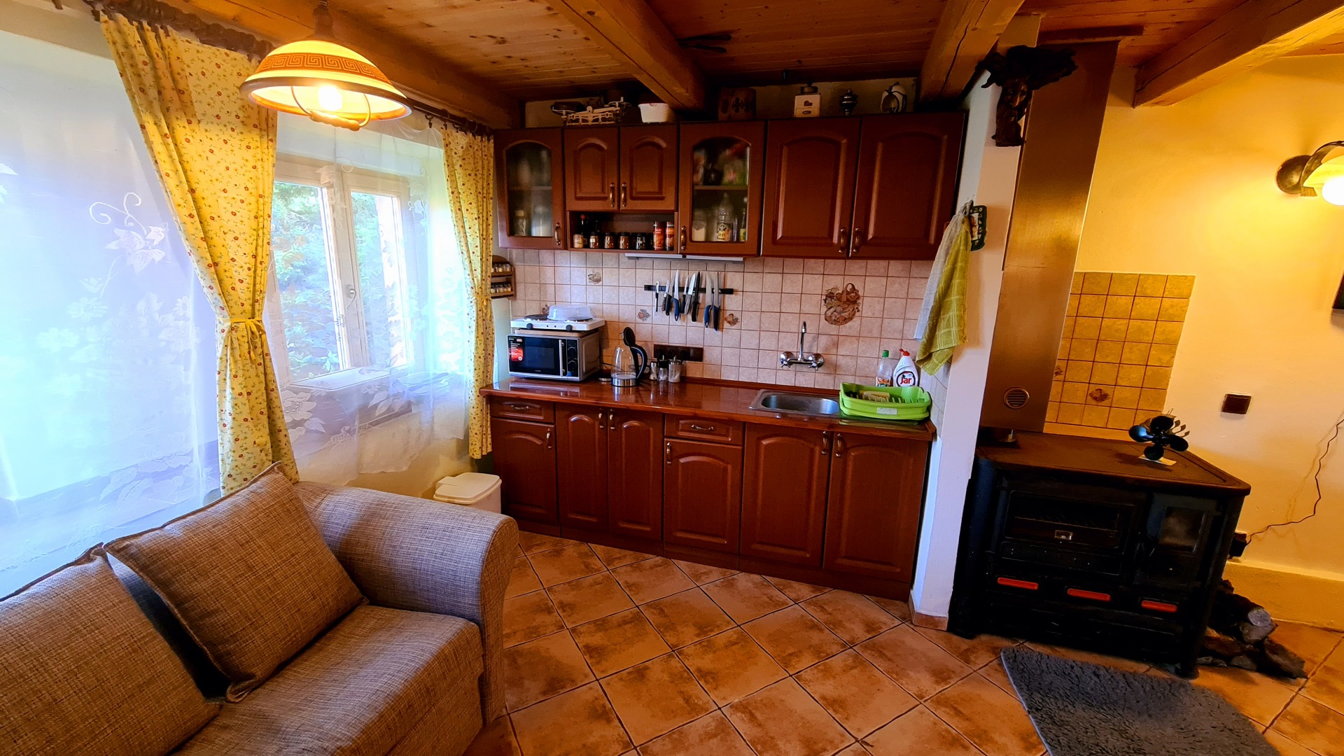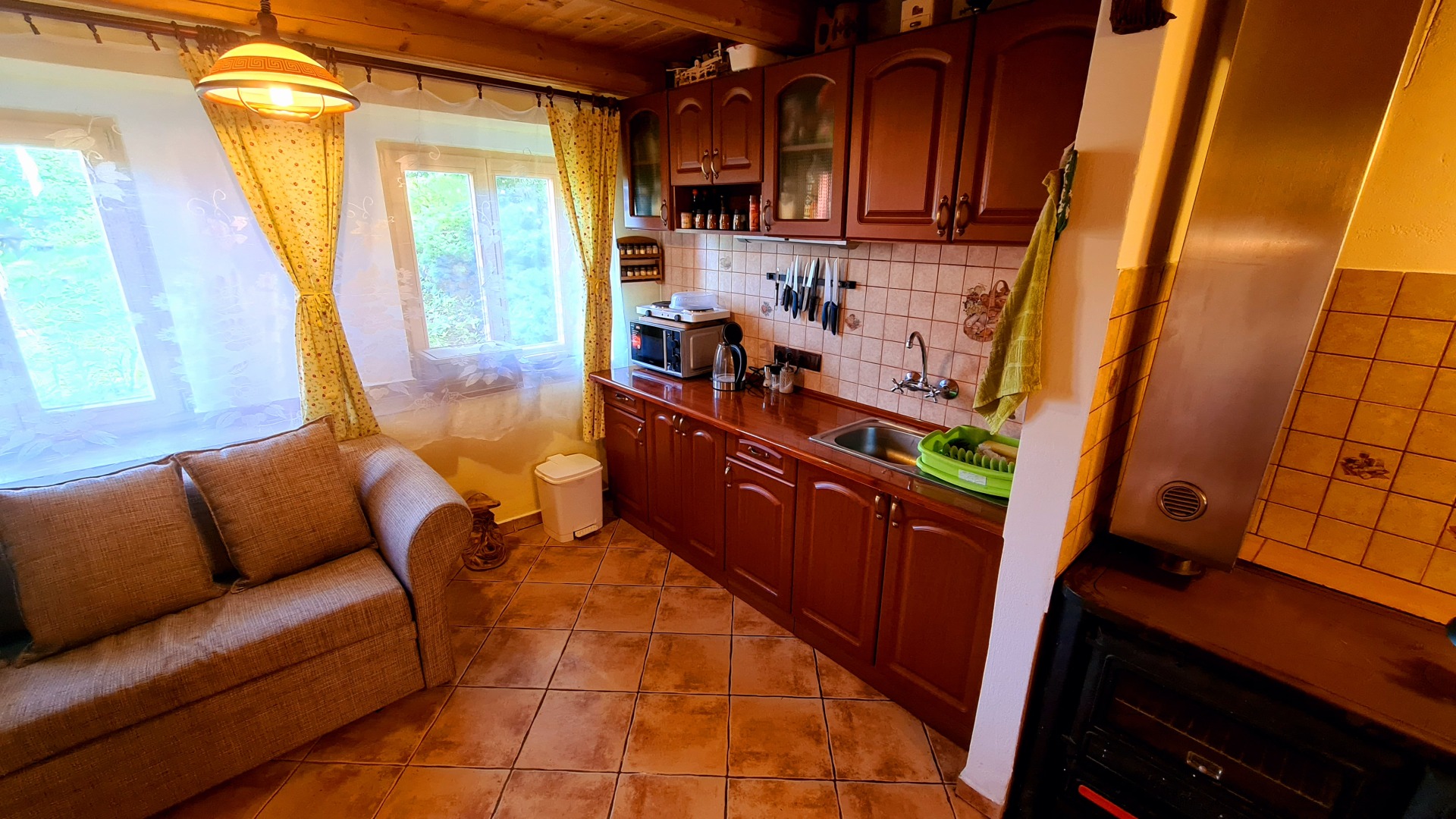 - kuchyňská linka (el. 2plotýnkový vařič, sporák na tuhá paliva, lednička s mrazákem, mikrovlnná trouba, rychlovarná konvice, pákový kávovar na espresso)