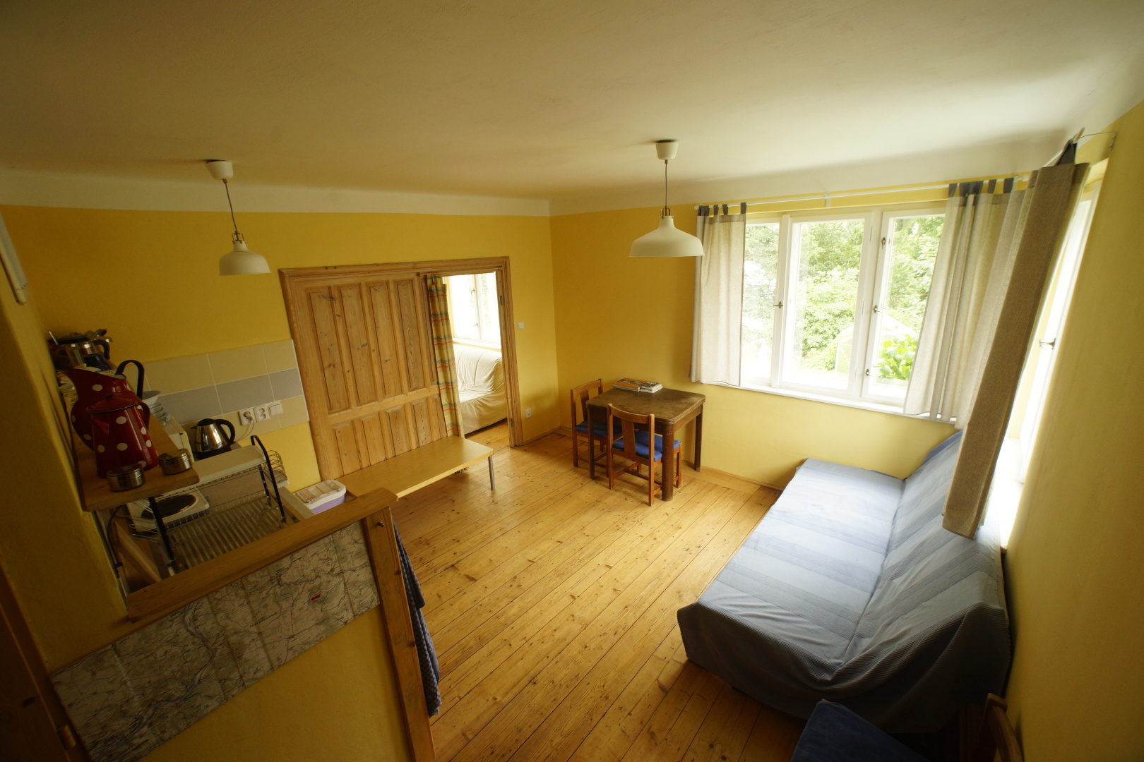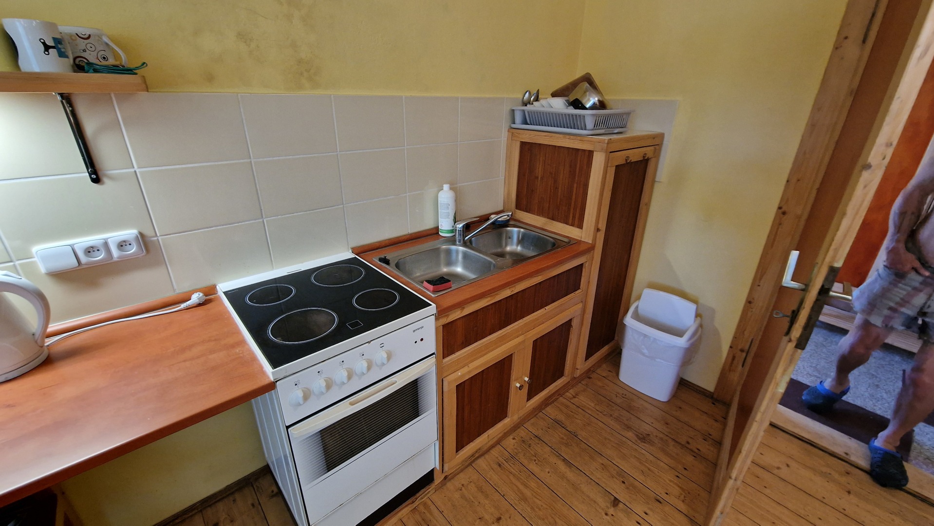 • kuchyňský kout (lednička, mikrovlnná trouba, rychlovarná konvice) v obytné místnosti s 2 lůžky (rozkládací pohovka)