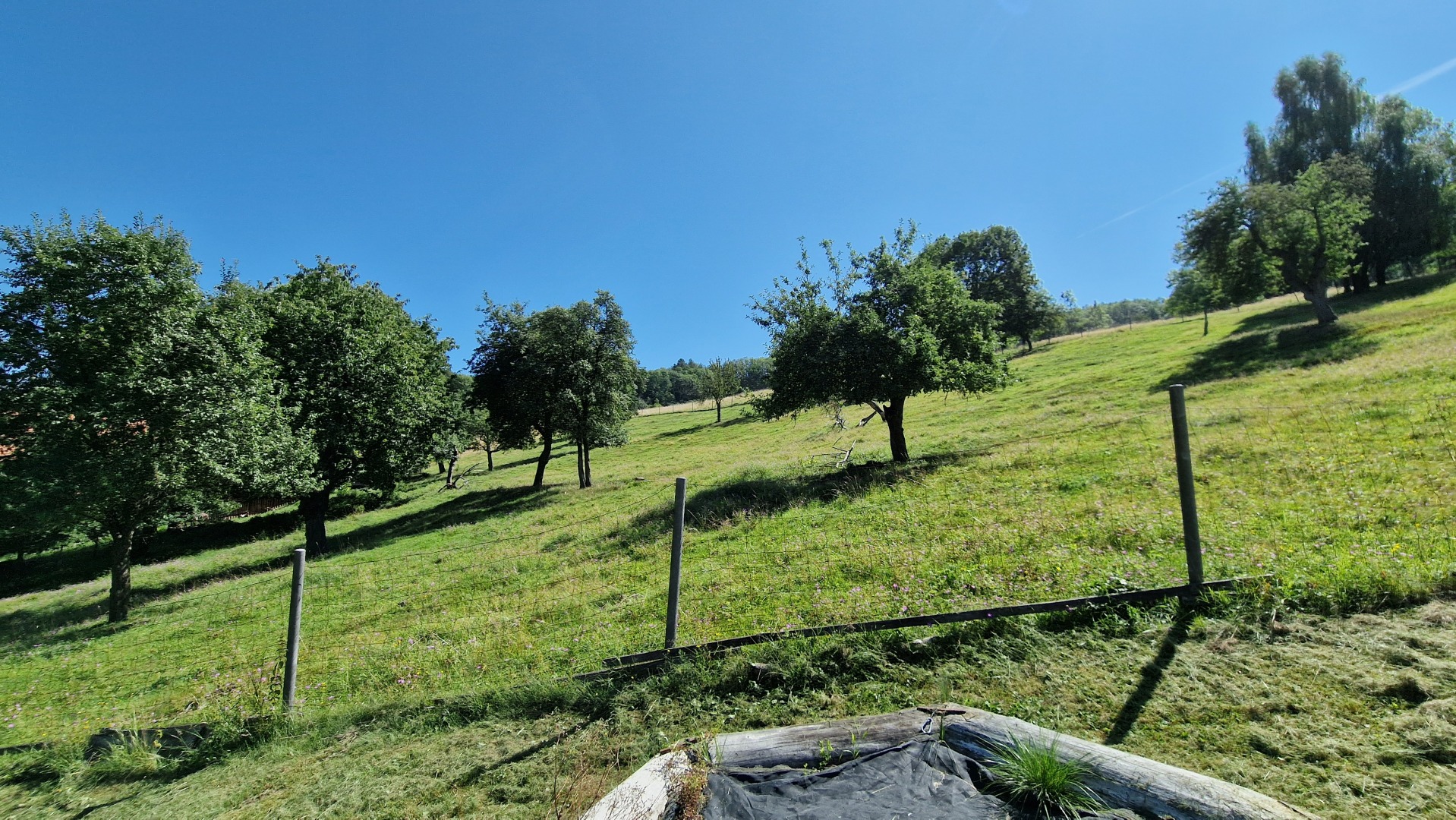 Hospodářství jako na dlani v malebné krajině Českého středohoří s krásnými výhledy na pasoucí se zvířata.